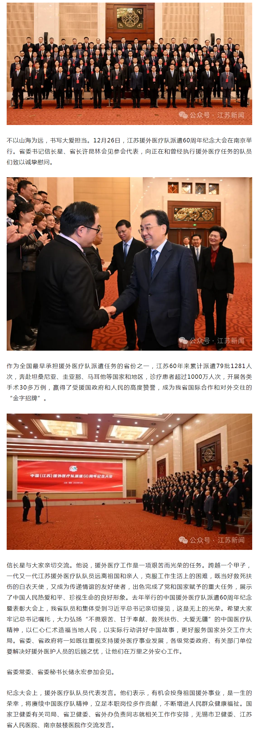 信长星许昆林会见江苏援外医疗队派遣60周年纪念大会代表 以仁心仁术造福当地人民传递深厚情谊