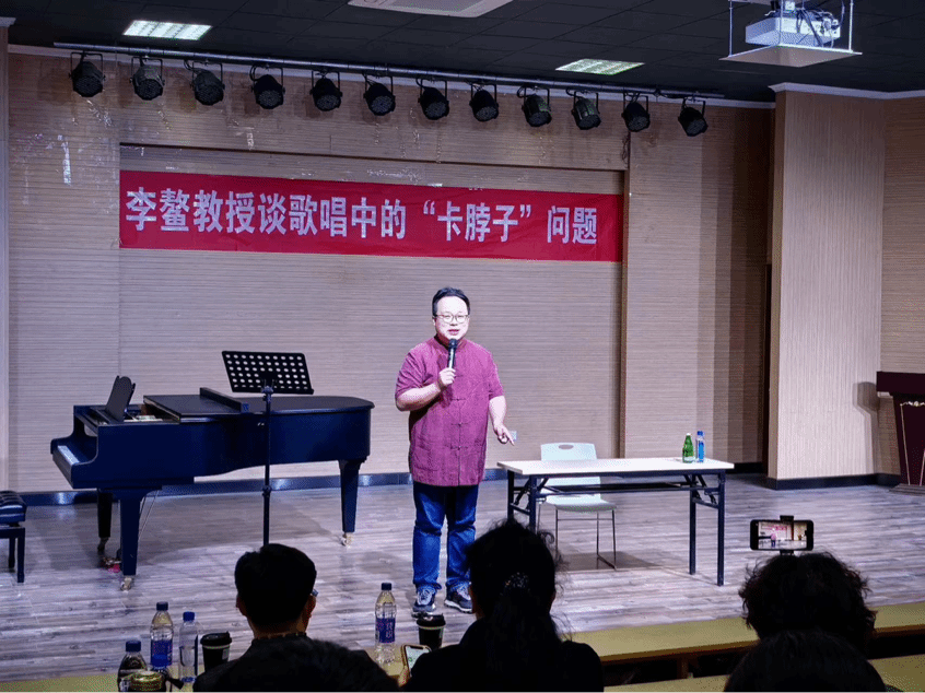 李鳌老师以幽默风趣、循循善诱的方式开讲,他首先阐明了什么是歌唱中的“卡脖子”问题,继而从发声理念、歌唱技术、作品风格、发音吐字、审美认知、歌词意境、舞台实践等方面逐一答疑释惑,为全体与会者生动讲解了演唱技术、声乐学习方法及歌唱的审美问题。