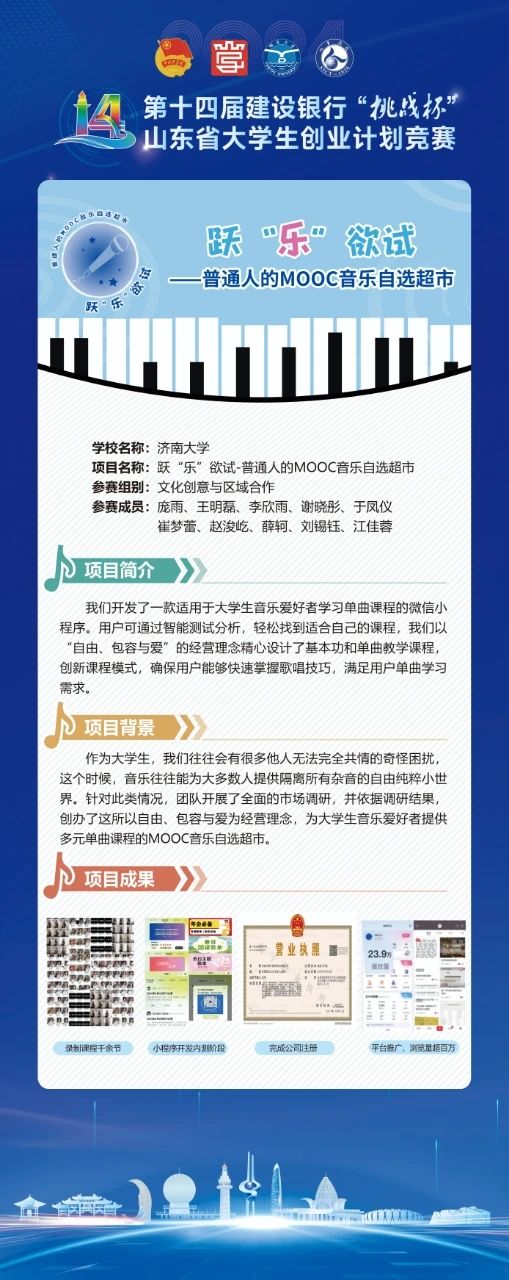跃“乐”欲试——普通人的MOOC音乐自选超市项目基于信息碎片化时代民众追求高效率活动的背景,在前期市场调研阶段时我们发现市场中存在单曲学习需求,并且绝大多数大学生音乐爱好者想拥有个性化程度高、灵活性强、富有人文关怀的音乐课程。基于调研结果,项目开发了一款微信小程序,为大学生音乐爱好者提供多元单曲课程以供使用学习。课程组成员创新式设计全新教学法,小程序内嵌智能水平评估与推荐系统、情感交流互动版块,为用户形成专属自己的个性化音乐世界。