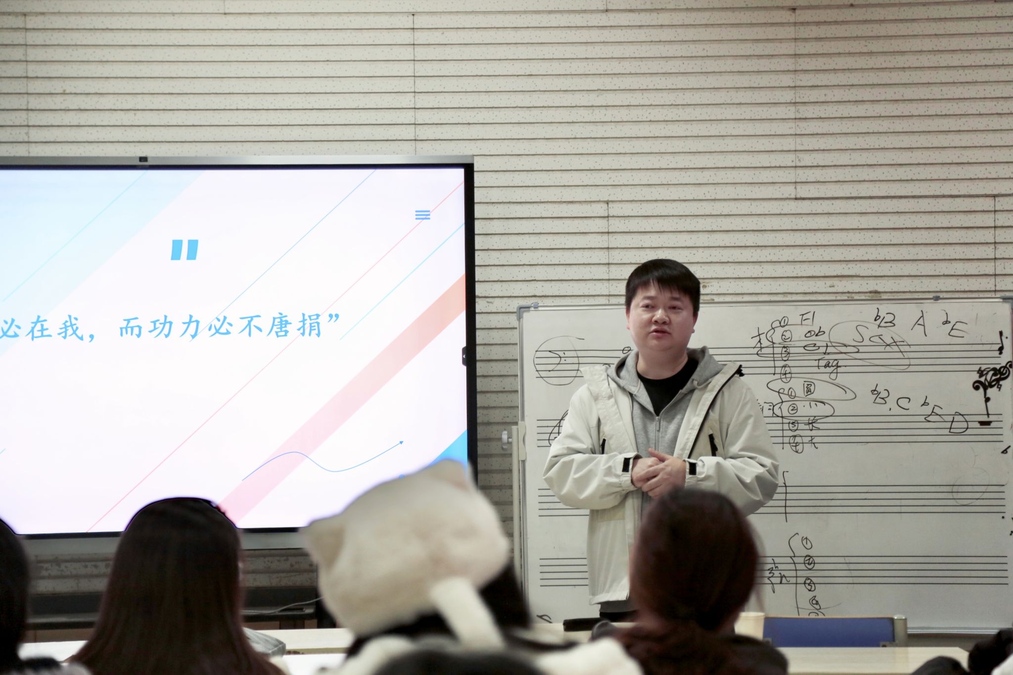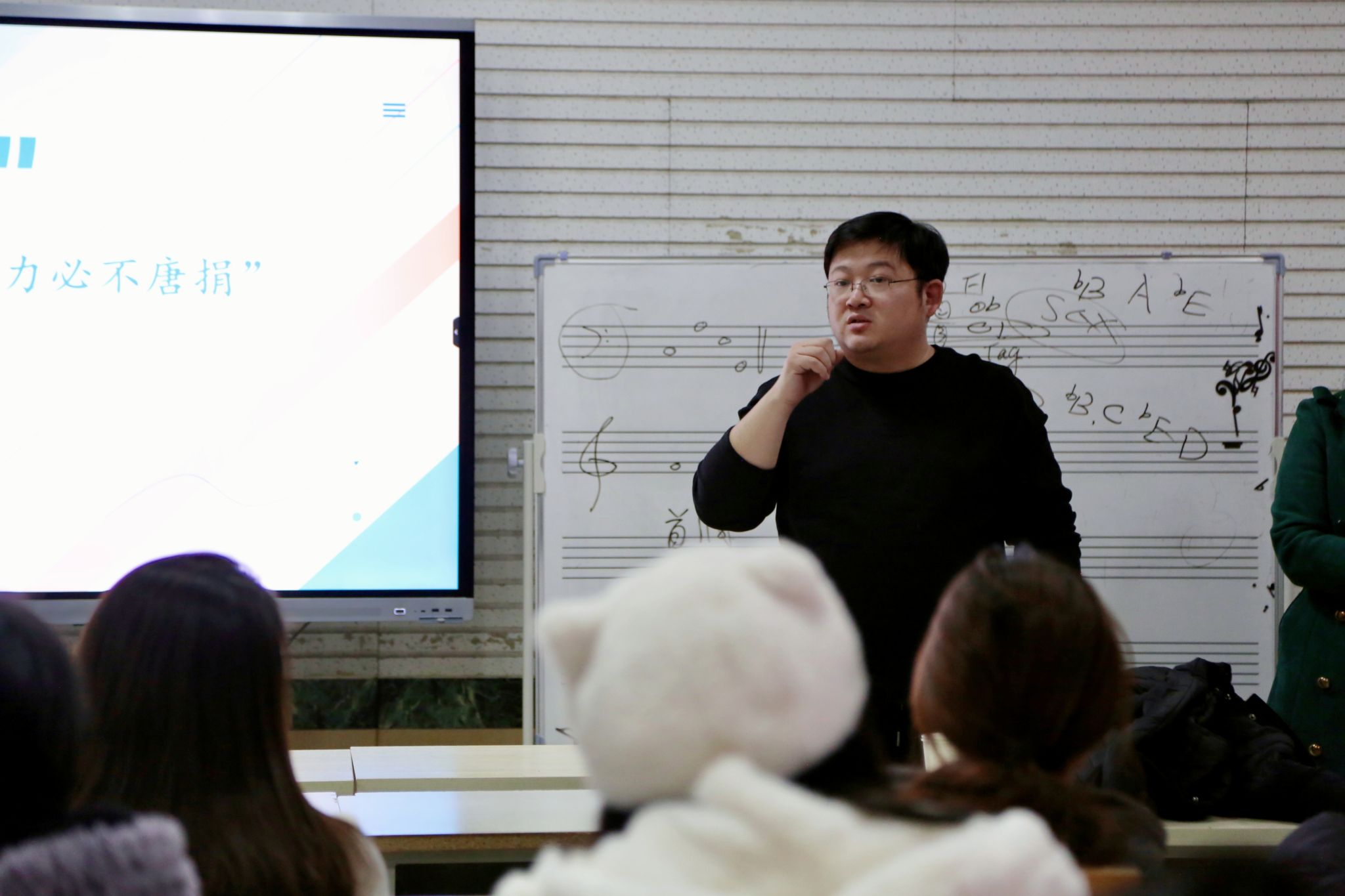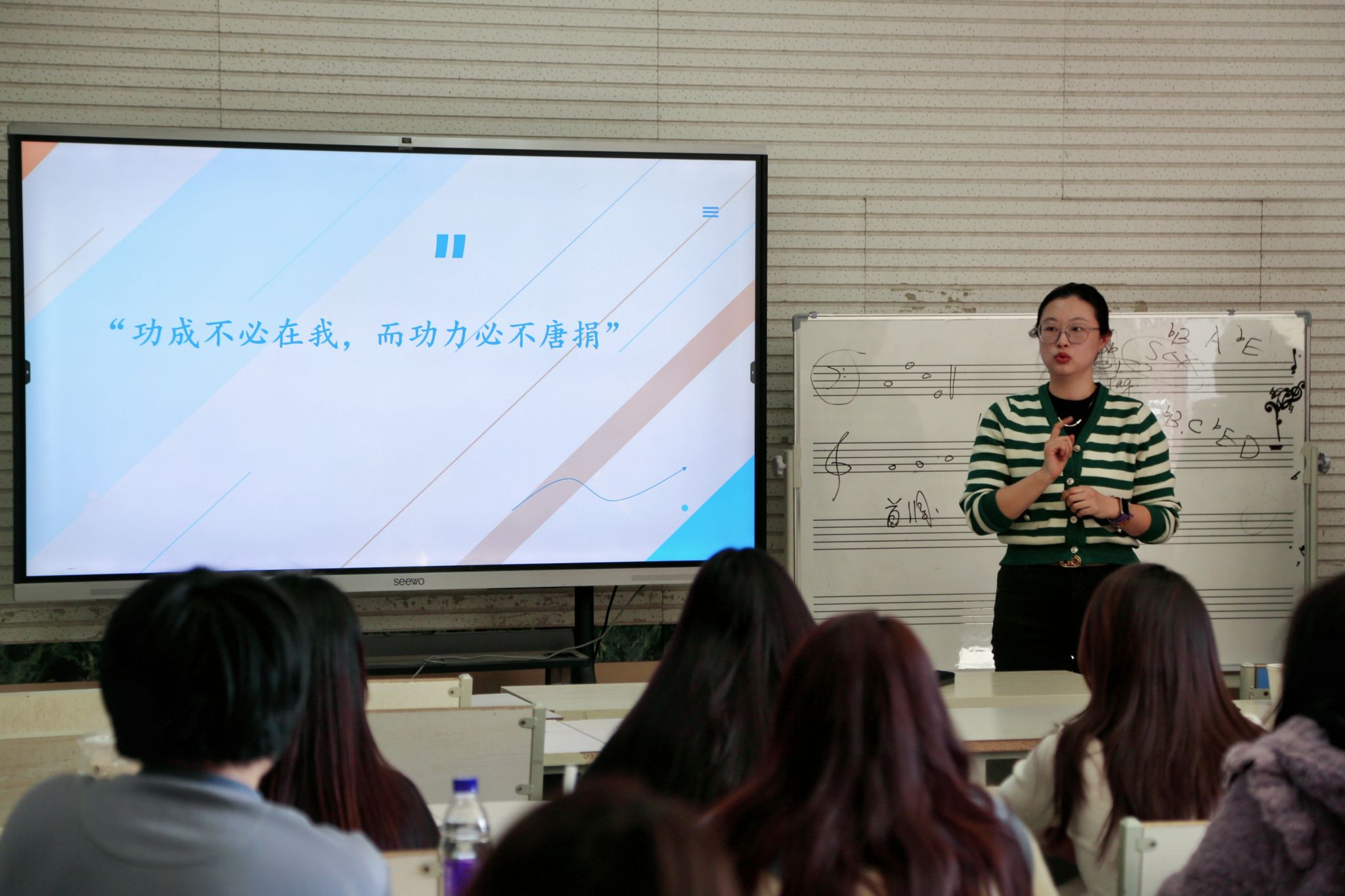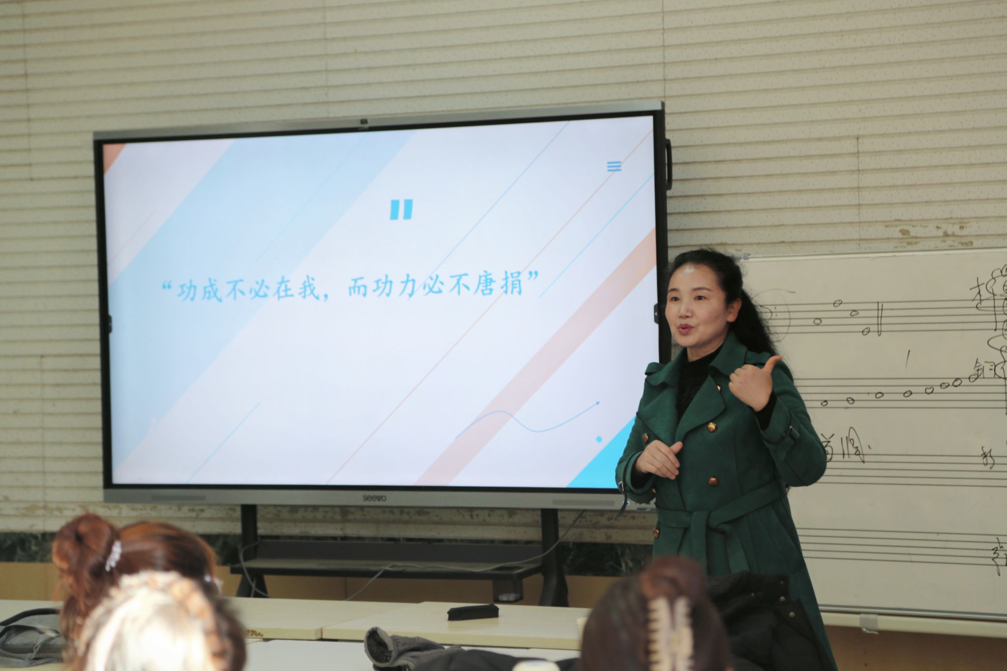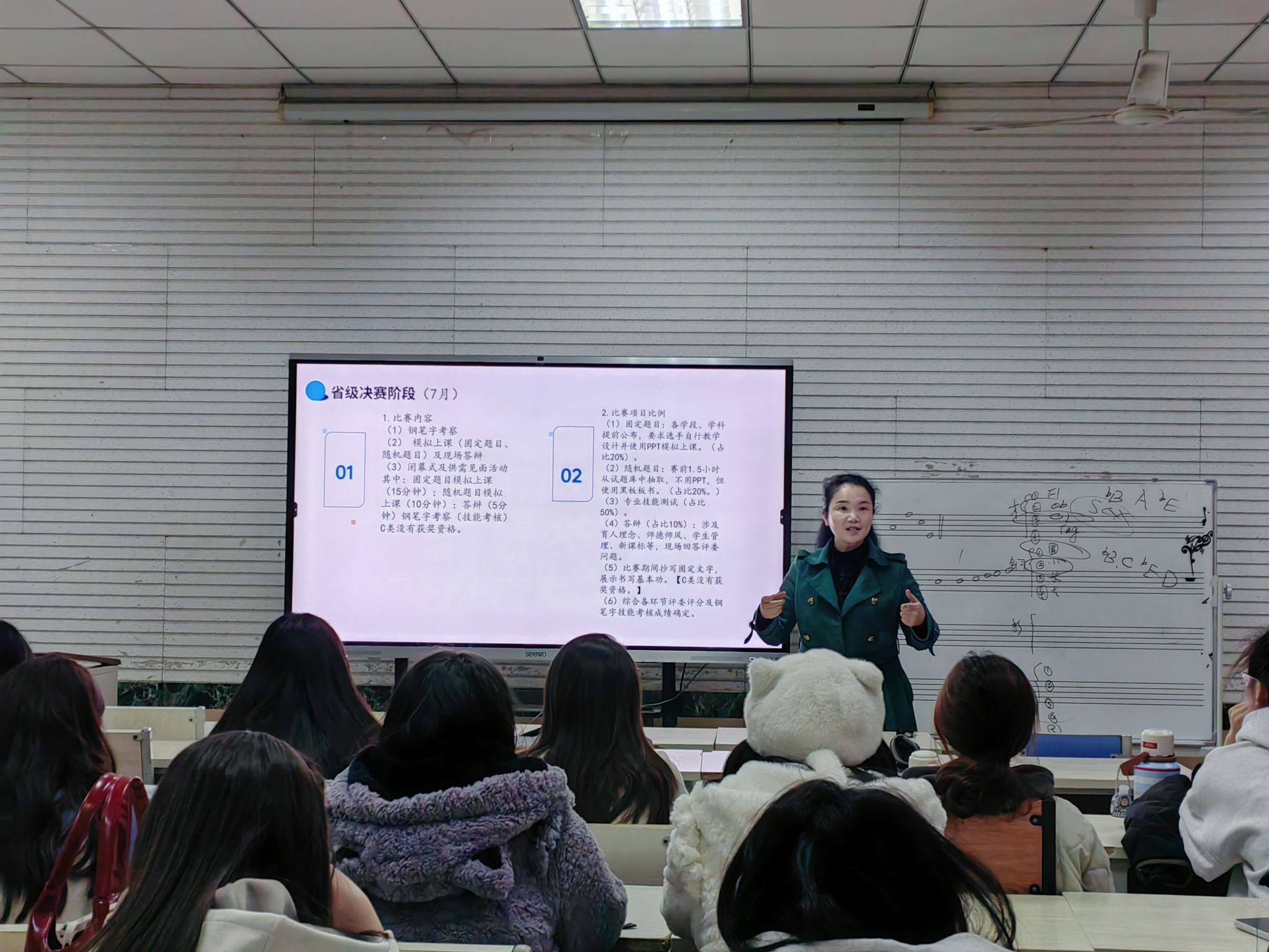 杨瑞教授还针对山东省师范生从业技能大赛的相关政策、比赛流程、比赛的内容、评分标准、重要时间节点等多个方面进行了详尽解读,使同学们对从业技能大赛有了更为全面深刻的理解,为后续参赛奠定了坚实的基础。杨教授强调,大赛对于学生就业、考研以及专业素养的综合提升均具有关键意义,她鼓励全体师范生踊跃参与,为将来踏上教学岗位,成长为优秀的中小学音乐教师奠定基础。