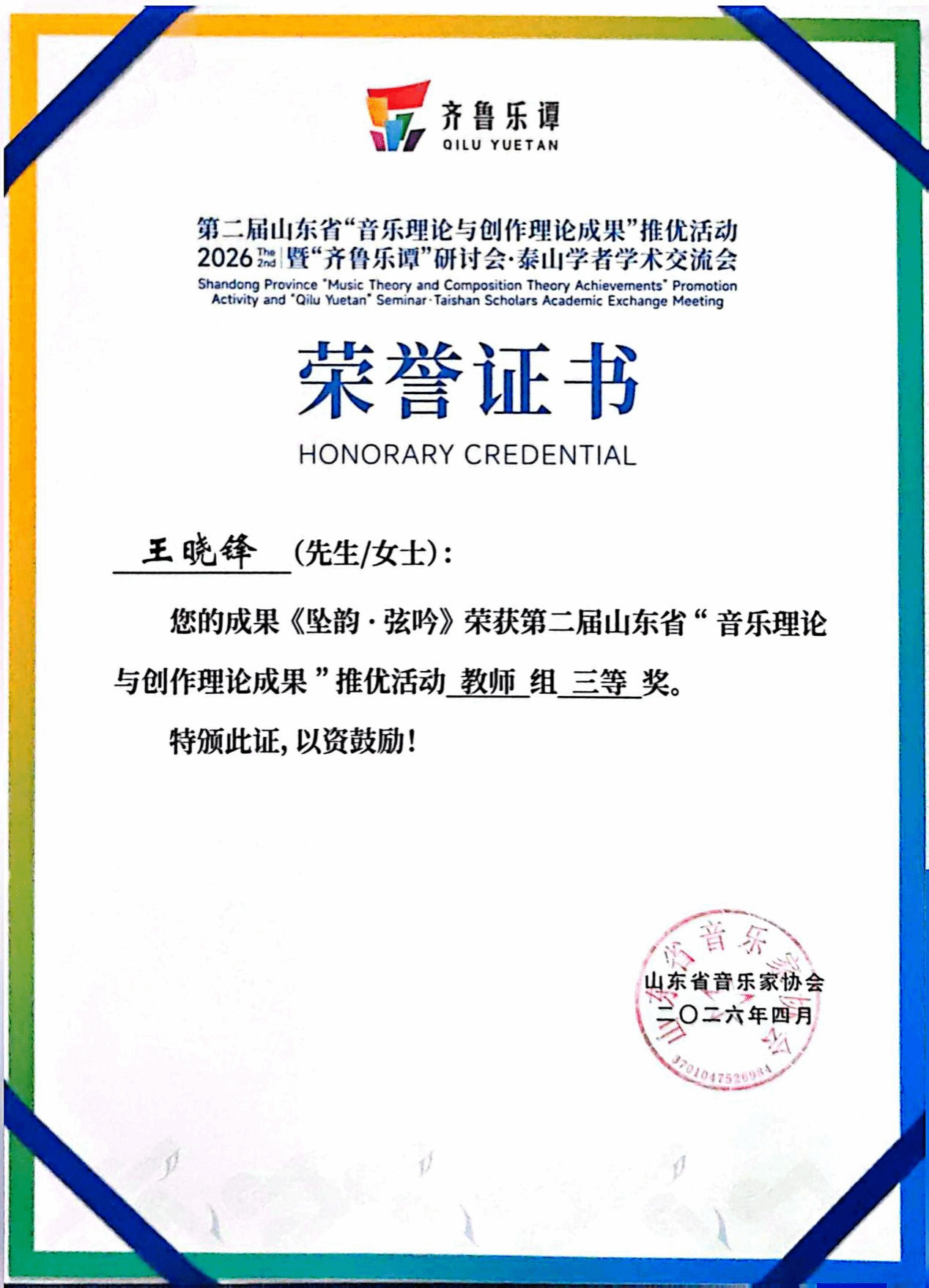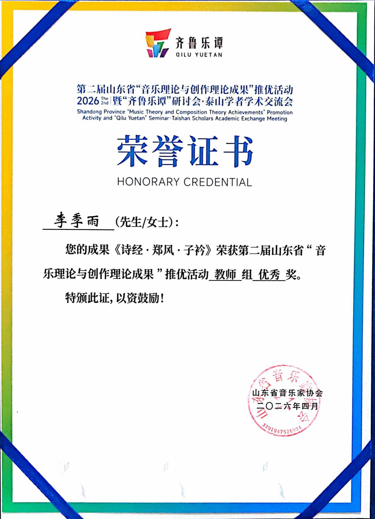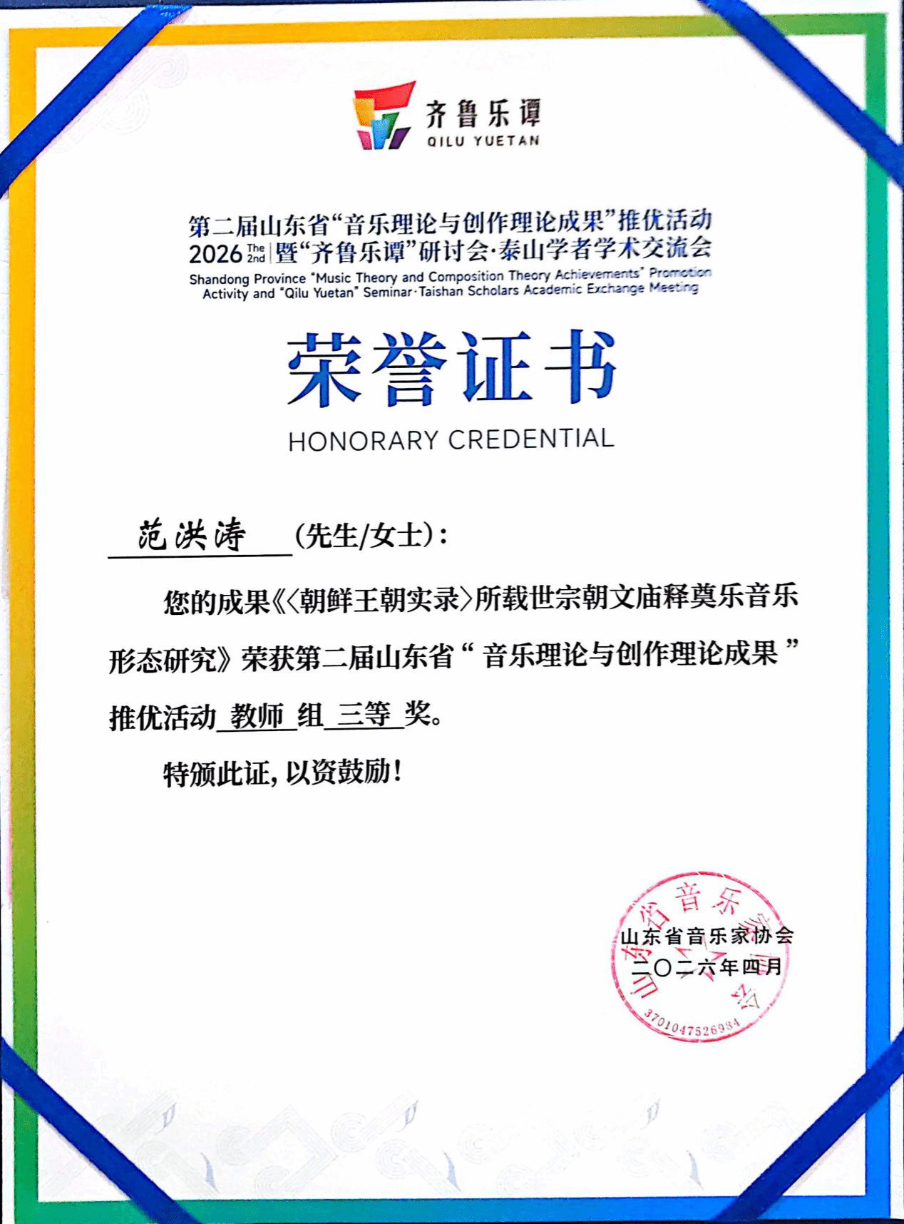 杨瑞教授的《压缩与延展:山东琴书的多模态转译与再生》获教师著作类二等奖;范洪涛老师的《〈朝鲜王朝实录〉所载世宗朝文庙释奠乐音乐形态研究》获教师著作类三等奖;王晓锋老师的《坠韵·弦吟》获教师组作品类三等奖;李季雨老师的《诗经·郑风·子衿》获教师组作品类优秀奖;音理2401班曹梦冉的《“新史学”疏义及对音乐学界之影响研究》获学生著作类二等奖(指导老师 范洪涛);音理2301班孟书涵的《“狩猎”的音画转译——浪漫主义钢琴小品中的意象塑造与风格诠释》获学生著作类三等奖(指导老师 左丹婷)。