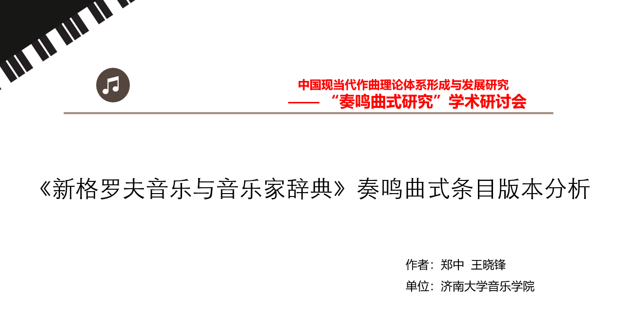 会上,郑中院长、王晓锋老师就共同完成的论文《<新格罗夫音乐与音乐家辞典>奏鸣曲式条目版本分析》,在此次研讨会上进行了宣讲。论文选取奏鸣曲式条目进行版本分析,更加全面地把握奏鸣曲式理论发展与成熟的脉络,在概念表述的调整、内容结构的补充、音乐范例的分析、参考文献的选取等方面展开比较研究,以期对奏鸣曲式结构思维的衍展及其相关研究成果得出更科学规范的解读,并进一步分析把握奏鸣曲式结构原则边缘交叉应用的方式方法,是对现有曲式学教学内容的补充与完善,以此推动相关曲式结构思维的理论研究与教学、创作实践。