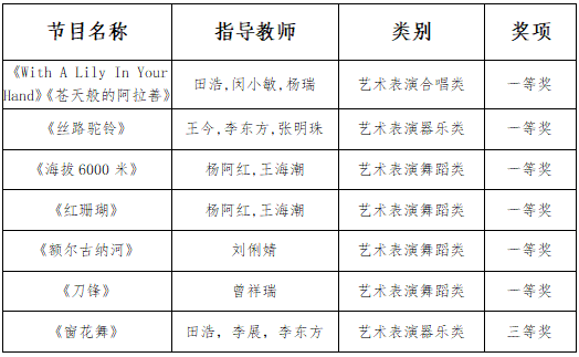 在此次活动中喜获佳绩,获得优秀创作奖1项、艺术表演奖一等奖6项(器乐类1项、合唱类1项、舞蹈类3项),三等奖1项。