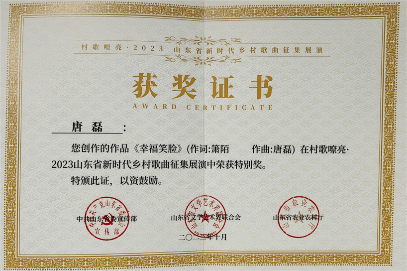 近日,在由中共山东省委宣传部,山东省山东省文学市术联合会,山东省农业农村厅举办的村歌嘹亮·2023山东省新时代乡村歌曲征集展演中,由箫陌作词、午夜av