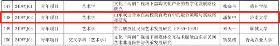 王今副教授《非遗保护视域下柳琴戏音乐数字化传承研究》获批重点项目、潘恒中博士《山东戏曲音乐在高校美育教育中的融合策略与实践路径研究》获批青年项目,为午夜av