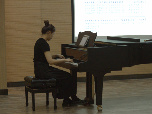 2021级学生刘小嘉、刘亚菲分别进行唱歌课《明天会更好》、欣赏课《谁不说俺家乡好》的课例展示。两位同学将知识讲授、音乐创编、合唱指挥、体态律动等融入教学中,教学过程完整。展示结束后,孙琳对教学中存在的问题进行细致点评,她建议同学们要重视课程导入环节,并建议要注重课程讲解的逻辑性与感染力,同时还要首尾呼应,在教学中要通过课程思政、以美育人等充实教课堂,提升课堂高度。