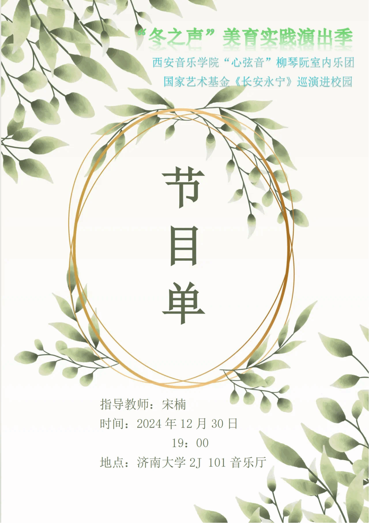 “心弦音”柳琴阮室内乐团将来到济大校园,这是一支汇聚了众多杰出音乐家的精英团队,他们将用指尖的魔法,将国粹之美演绎得淋漓尽致。在即将到来的演出中,他们将携手国家艺术基金资助项目《长安永宁》,共同为我们开启一场穿越时空的文化之旅。