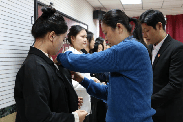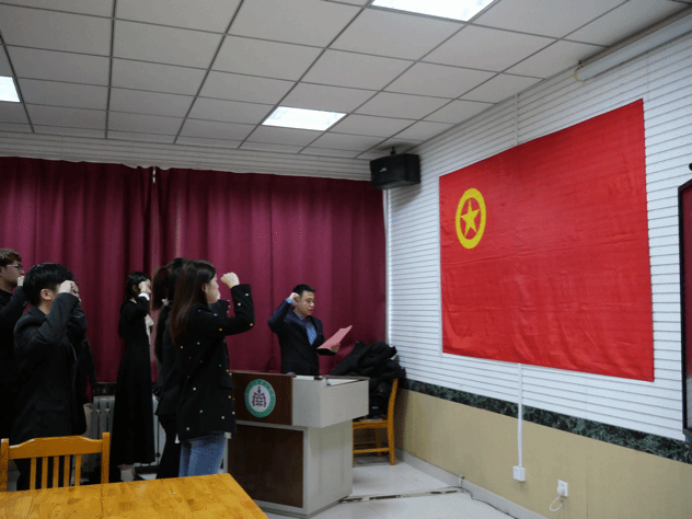 会议上,全体师生起立奏唱国歌,王栋宣读了新发展团员的名单,董晓宁为新团员颁发了团员证并佩戴了团徽。那熠熠闪烁的团徽,不仅仅象征着团员的身份,更代表着他们肩负的时代使命与责任。它是积极进取精神的传承,是对每个团员怀抱理想、勇攀高峰的殷切期望,更是展现青年们顺应时代,胸怀祖国,勇于担当的精神象征。