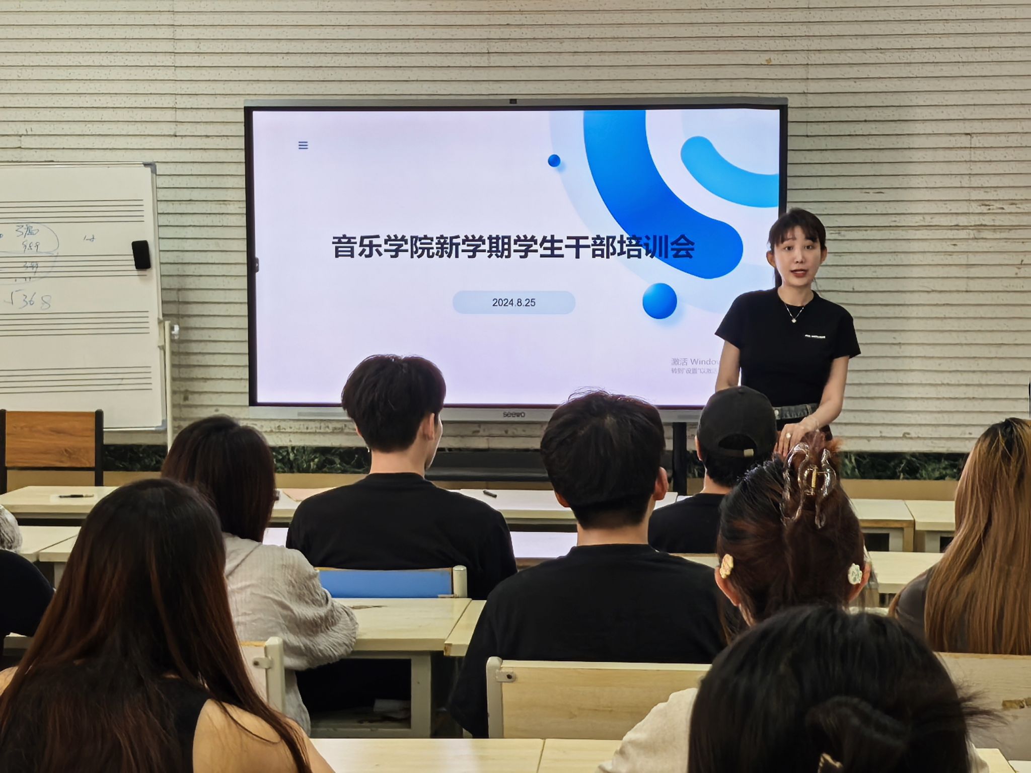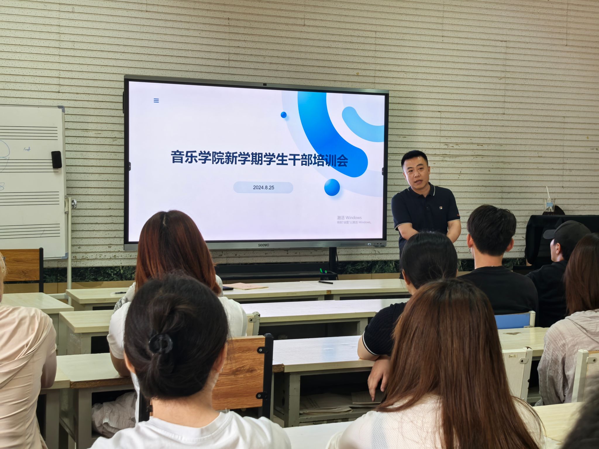 于多媒体教室二举行新学期学生干部培训会。学办主任兼团委书记王栋、学院团委老师何思儒及学生骨干共同参与此次会议。