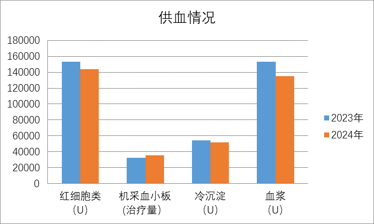 自2024年1月至12月,全年献血共计104640人次,献血量34.62吨,同比分别下降2.36%和2.17%;供应各类血液产品366224.75单位,同比下降了6.87%。